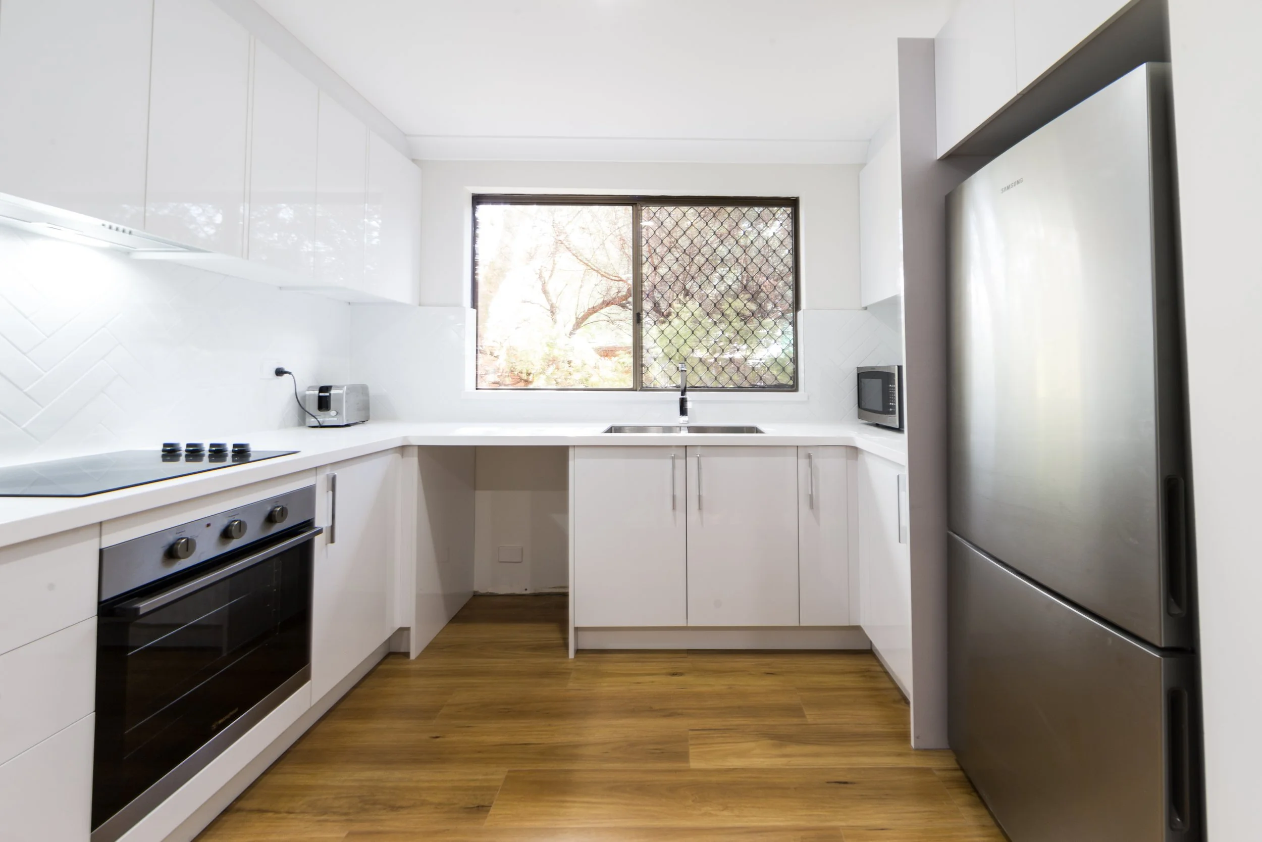 Kitchen with white cabinetry, stainless steel refrigerator, oven, microwave, and a window overlooking greenery.
