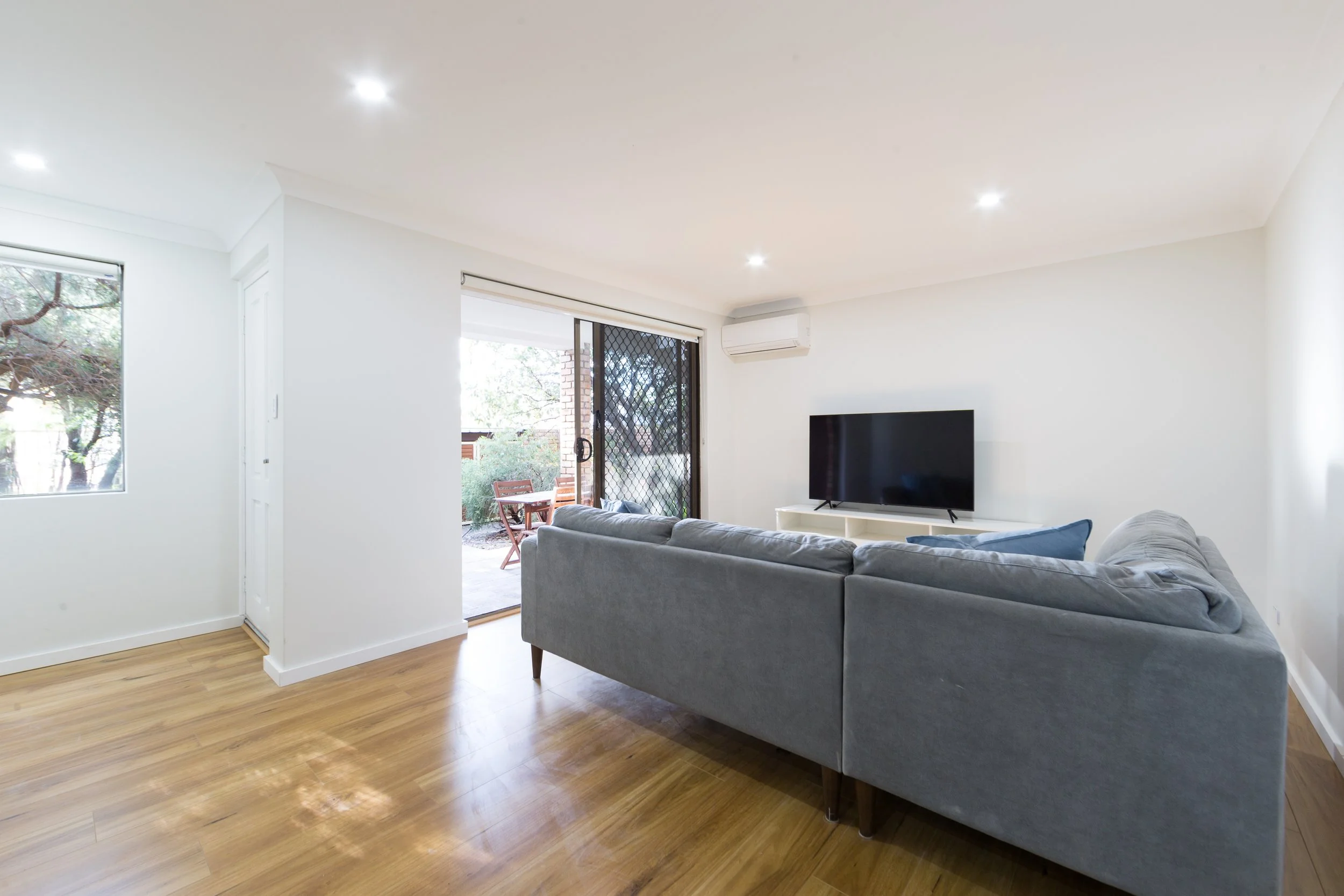 Living room with a gray sofa, a flat-screen TV on a white TV stand, a sliding glass door leading to an outdoor patio with wooden table and chairs, a window showing greenery, hardwood flooring, and white walls with recessed lighting.