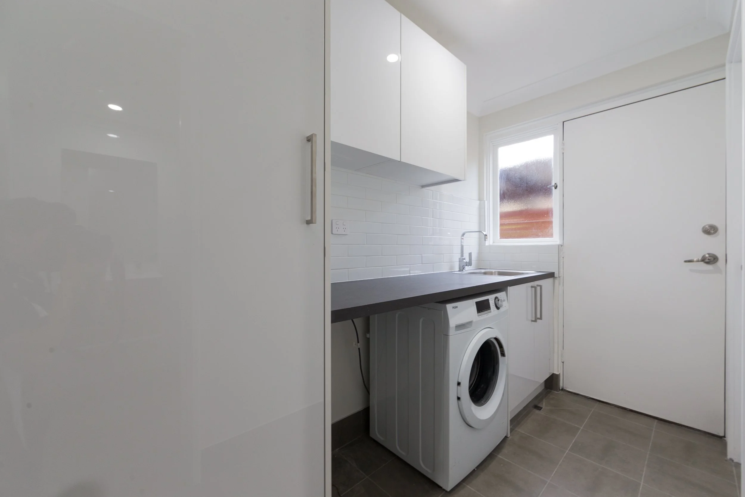 A laundry room featuring a front-loading washing machine beneath a dark countertop, white wall-mounted cabinets, a stainless steel sink with a faucet, and a window with frosted glass.